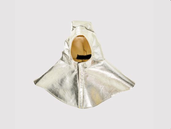 Capuz de segurança confeccionado em tecido de algodão aluminizado, costurado todo em linha de aramida, fechamento em velcro com lapela de segurança.