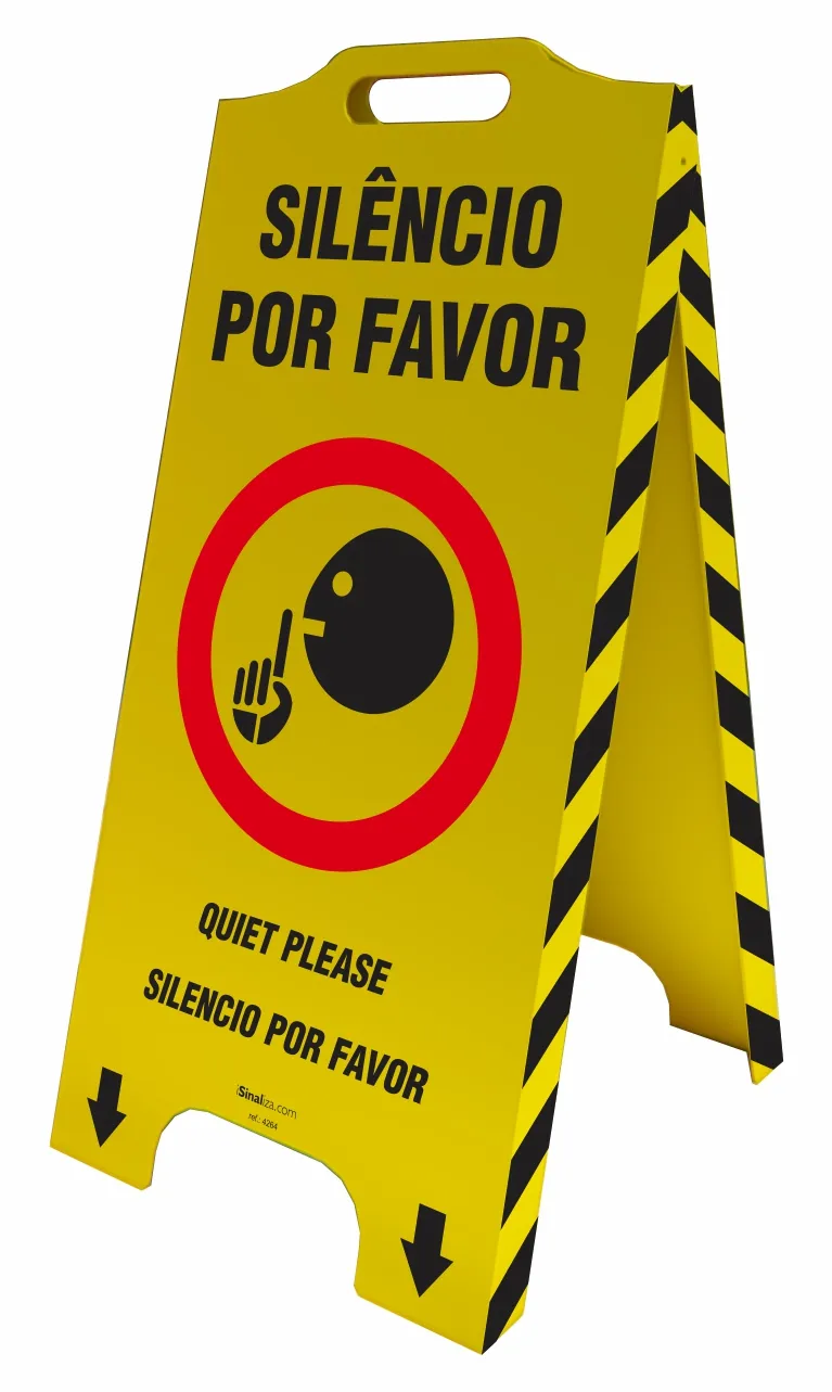 O cavalete de sinalização Silêncio Por Favor (trilíngue), é utilizado para alertar de forma simples e segura ambientes que necessitam de silêncio. As informações contidas nos cavaletes estão nos idiomas português, inglês e espanhol.