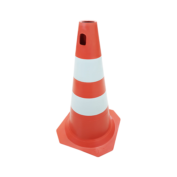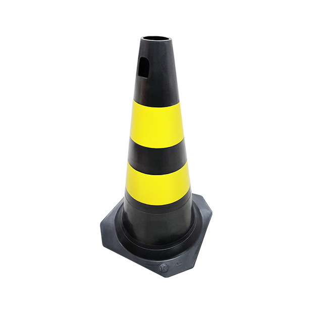 Cone injetado em PP (Polipropileno) numa peça única nas cores preto e amarelo ou laranja e branco. Faixas injetadas numa única peça, juntamente com o corpo do cone.