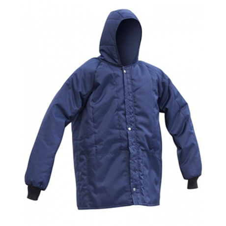 Japona de segurança confeccionada em náilon com tratamento em resina, com forro térmico em manta acrílica e capuz acoplado.