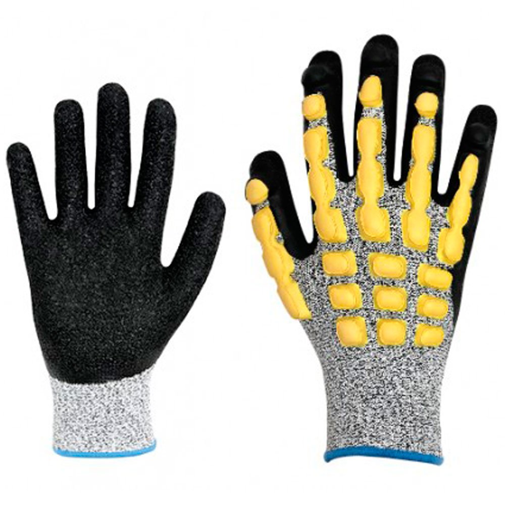 Luva de segurança confeccionada em fibras sintéticas, 13 gauge, revestimento da face palmar e ponta dos dedos em látex corrugado; dorso com gomos em borracha termoplástica (TPR), punho com inserções de fibras elásticas e acabamento em fibras sintéticas.
