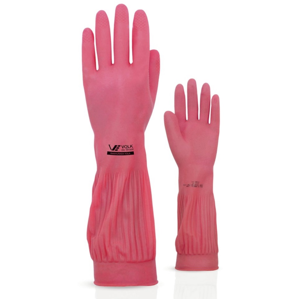 Luva de segurança confeccionada em látex natural, acabamento interno liso (clorinado), antiderrapante na palma e face palmar dos dedos.