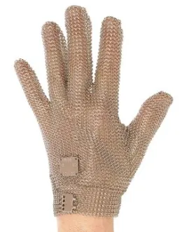 Luva de segurança confeccionada em malha de aço inoxidável, punho curto.