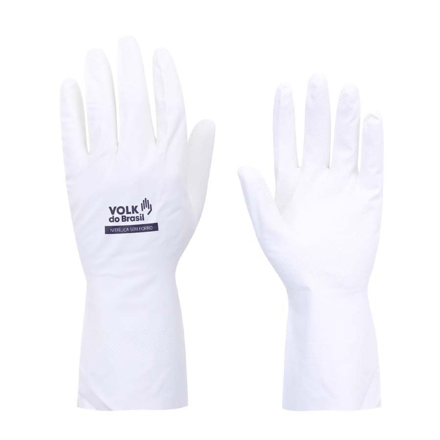 Luva de segurança confeccionada em nitrila, relevo antiderrapante na face palmar e ponta dos dedos.