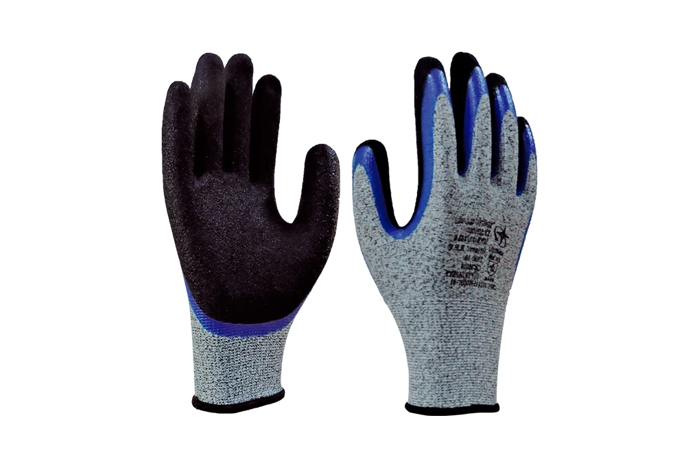 Luva de segurança confeccionada em suporte têxtil, com fios de HPPE, fibra de vidro e elastano, revestimento em borracha nitrílica na palma, dedos e face dos dedos; Punho tricotado com elástico, acabamento em overloque.