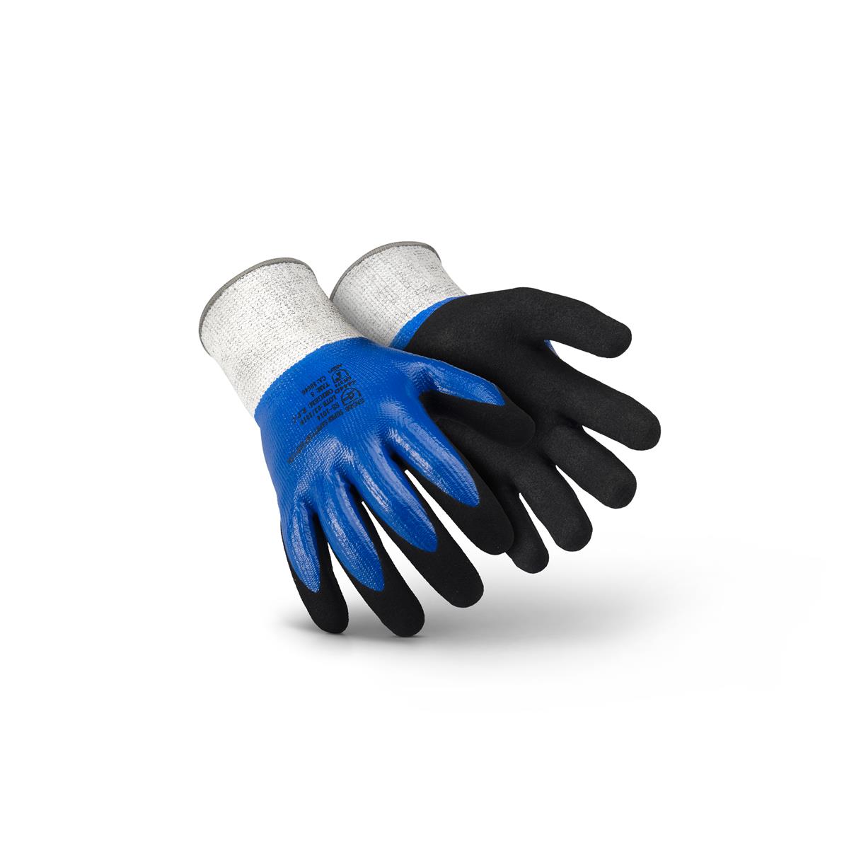 Luva de Segurança confeccionada em fios de polietileno de alta densidade e fio de fibra de vidro, com duplo banho nitrílico, liso no dorso e espumado na face palmar e pontas dos dedos.