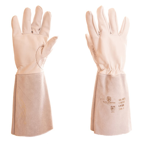 Luva de segurança confeccionada em vaqueta, com reforço no polegar e reforço entre os demais dedos.