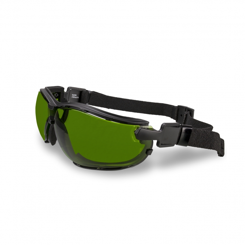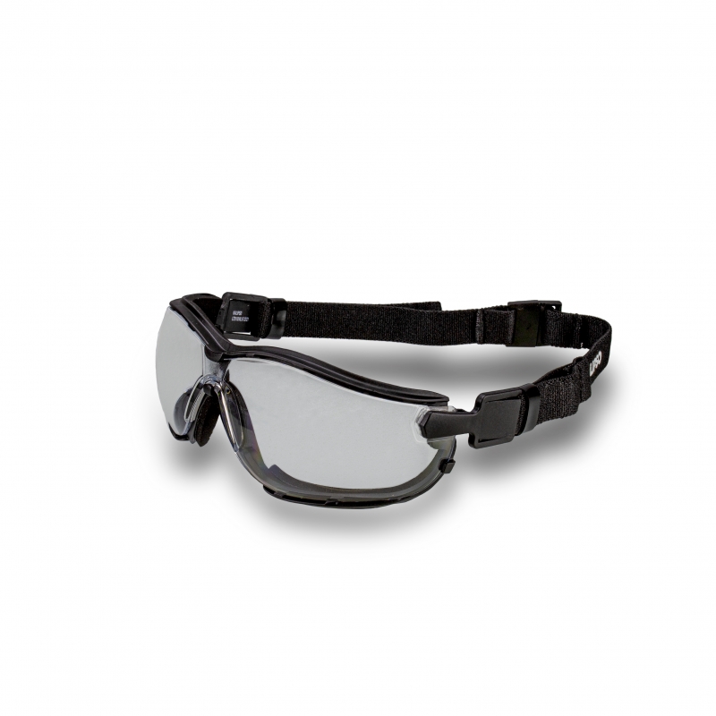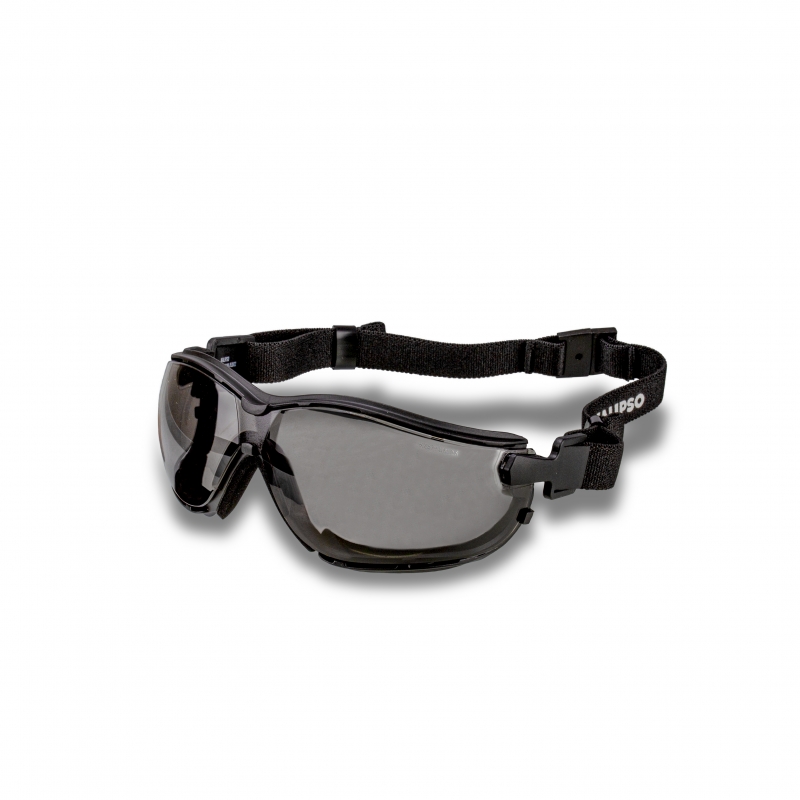 Óculos de segurança tipo ampla visão constituídos de armação confeccionada em uma única peça de plástico rígido preto com sistema de ventilação indireta composto por sete fendas localizadas na parte superior e seis fendas na parte inferior das bordas da armação, visor confeccionado em policarbonato disponível nas cores incolor e cinza encaixado à armação nas laterais e na parte central através de pinos de apoio, espumade poliuretano preto na parte interna da armação e suporte nasal, semi-haste tipo presilha plástica fixada nas extremidades laterais do visor de modo a permitir a colocação de tirante elástico que se ajusta à face do usuário através de regulagem de tamanho, onde este tirante possui uma presilha para fechamento. O modelo cobre toda a região em torno dos olhos do usuário.
