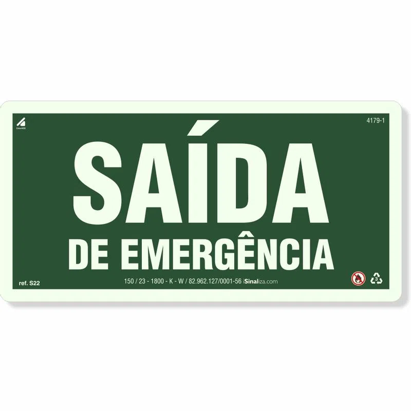 A placa fotoluminescente “Saída de Emergência”, é Fabricada em PVC fotoluminescente com 2 mm de espessura e superfície antiestática. A placa indica a direção de saída de emergência, sendo ideal para ambientes com ou sem incidência de luz. A placa não contribui para a propagação de chamas quando submetida à ação de fogo, sendo classificada como “Retardador” em conformidade com a Norma IEC 60092-01:2002 exigido pela NBR 13434-3.