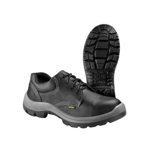 Calçado ocupacional de uso profissional, tipo caçado baixo (sapato), confeccionado em couro vaqueta, fechamento em atacadores (cadarços), com biqueira plástica estrutural, palmilha de montagem em nãotecido montada pelo sistema strobel, solado de poliuretano bidensidade injetado direto no cabedal, resistente à óleos combustíveis e com absorção de energia na área do salto.