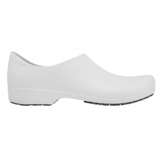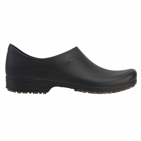 Calçado ocupacional (OB), classe II, modelo masculino, calçado baixo, cabedal polimérico.  Solado de borracha na cor bege, resistente ao escorregamento em piso de cerâmica contaminado com detergente e em piso de aço contaminado com óleo (SRC). Calçado inteiro impermeável a água (WR). Com absorção de energia na área do salto (E). Possui palmilha interna removível.
