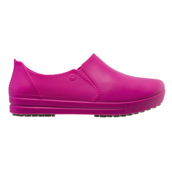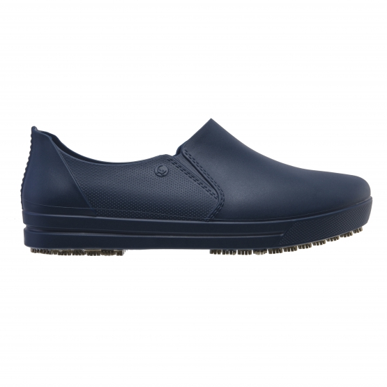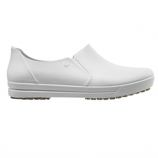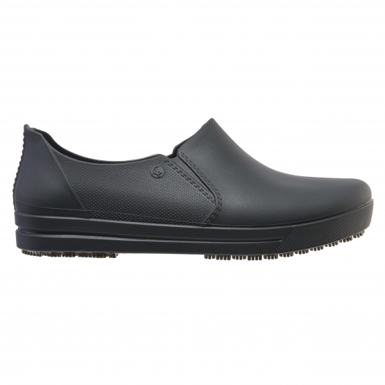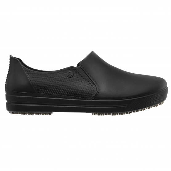 Calçado ocupacional (OB), tipo A (calçado baixo), classe II, confeccionado em material polimérico, com solado de borracha vulcanizada antiderrapante, com absorção de energia no calcanhar (E), solado resistente ao escorregamento em piso de cerâmica contaminado com detergente e piso de aço contaminado com glicerol (SRC) e calçado inteiro resistente a água (WR). Possui palmilha polimérica interna removível.