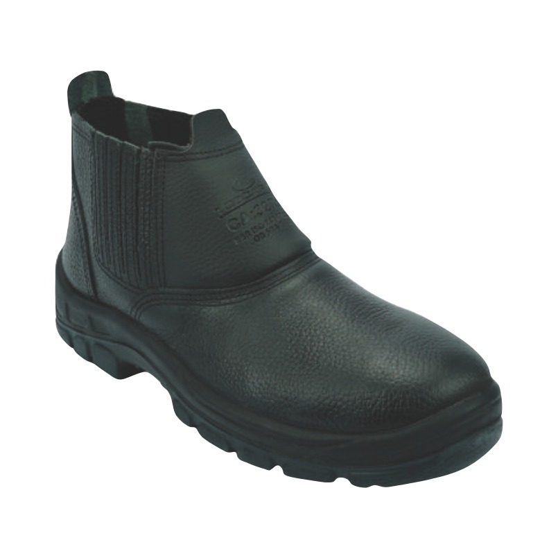 Calçado ocupacional, isolante elétrico, tipo botina, acolchoado na região do dorso, confeccionado em couro, gáspea e contraforte forrados em não tecido, palmilha de montagem em não tecido montada pelo sistema strobel, solado bicomponente de borracha nitrílica para altas temperaturas 300°C e PU (Poliuretano) injeção direta, biqueira plástica, palmilha de acabamento, para uso eletricista em tensão até 500 V a seco.