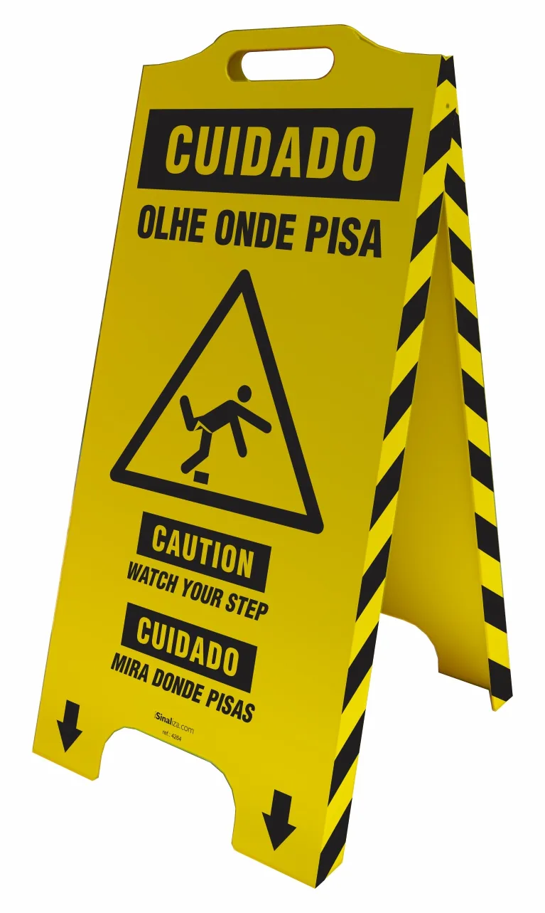 O cavalete de sinalização cuidado olhe onde pisa (trilíngue), é utilizado para alertar de forma simples e segura sobre possíveis acidentes. As informações contidas nos cavaletes estão nos idiomas português, inglês e espanhol.