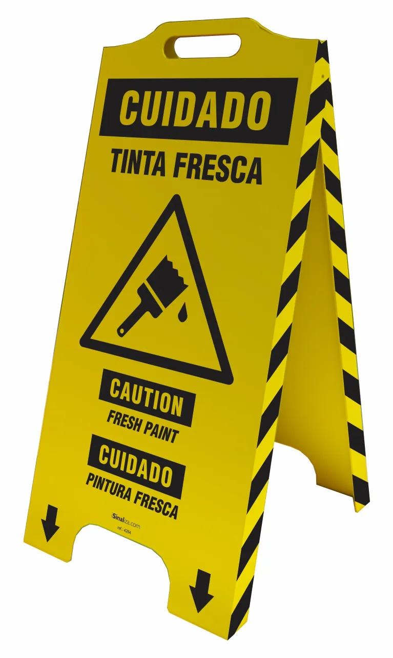 O cavalete de sinalização cuidado tinta fresca (trilíngue), é utilizado para alertar de forma simples e segura sobre possíveis acidentes. As informações contidas nos cavaletes estão nos idiomas português, inglês e espanhol.