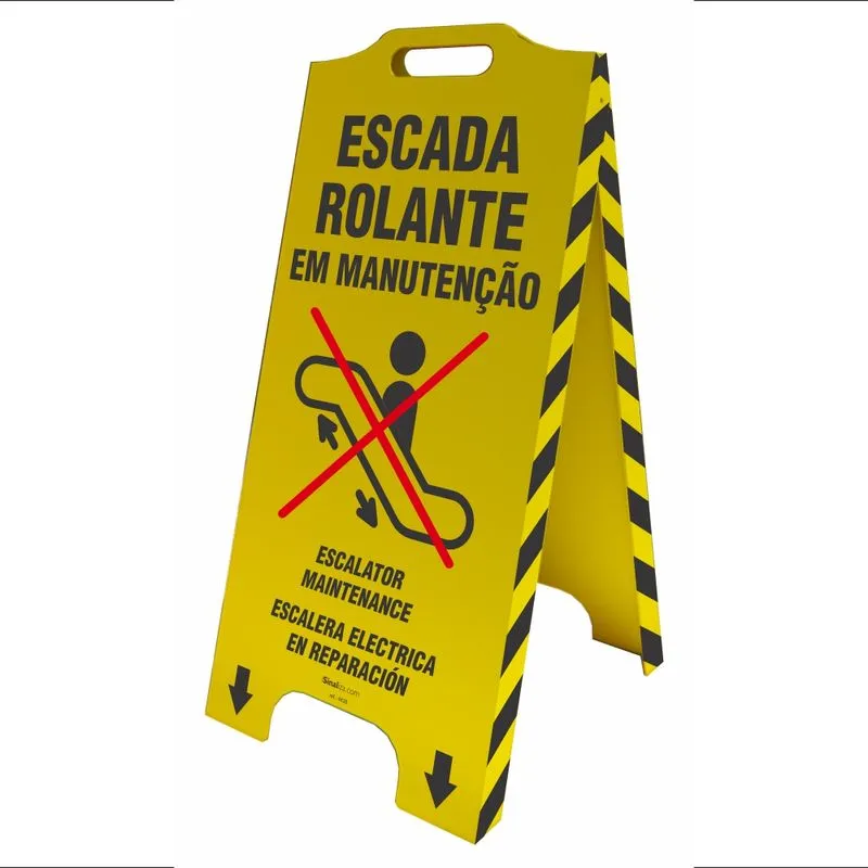 O cavalete de sinalização escada rolante em manutenção (trilíngue), é utilizado para alertar de forma simples e segura sobre possíveis acidentes. As informações contidas nos cavaletes estão nos idiomas português, inglês e espanhol.