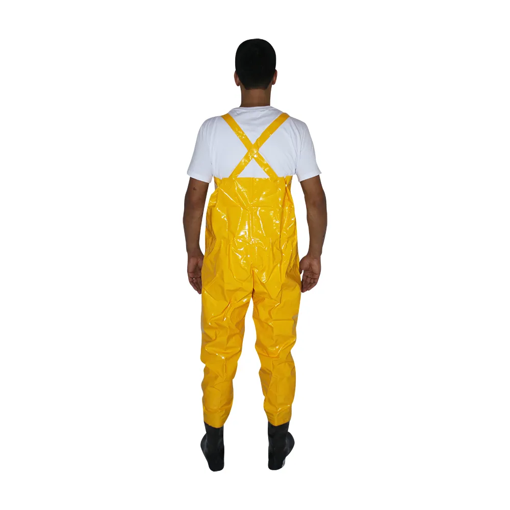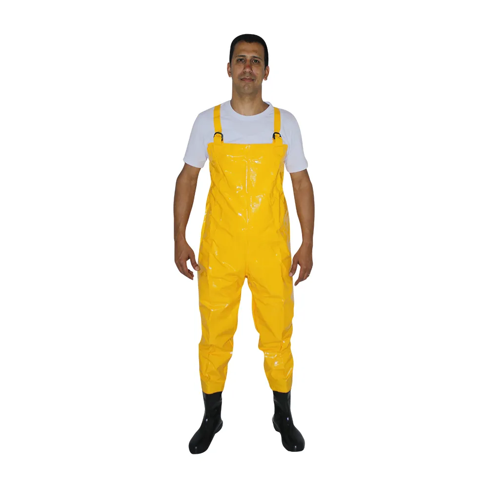 Jardineira de segurança para saneamento, confeccionada em tecido sintético plastificado com PVC em ambas as faces (trevira), costuras através de solda eletrônica, com suspensório do mesmo material da vestimenta com meia argola para ajustes, botas de PVC forradas acopladas (fabricante da bota: BSB Produtora de Equipamentos de Proteção Individual S/A – CA nº 37.456).