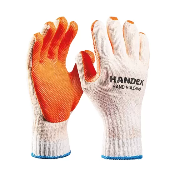 Luva de segurança confeccionada em fibras naturais e sintéticas, com revestimento na palma, face palmar e ponta dos dedos em látex natural vulcanizado, com acabamento rugoso antiderrapante, dorso ventilado, punho com inserções de fibras elásticas e acabamento em fibras sintéticas.