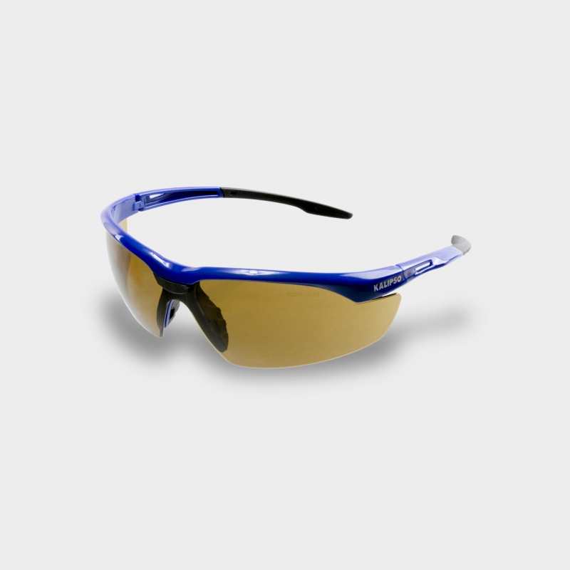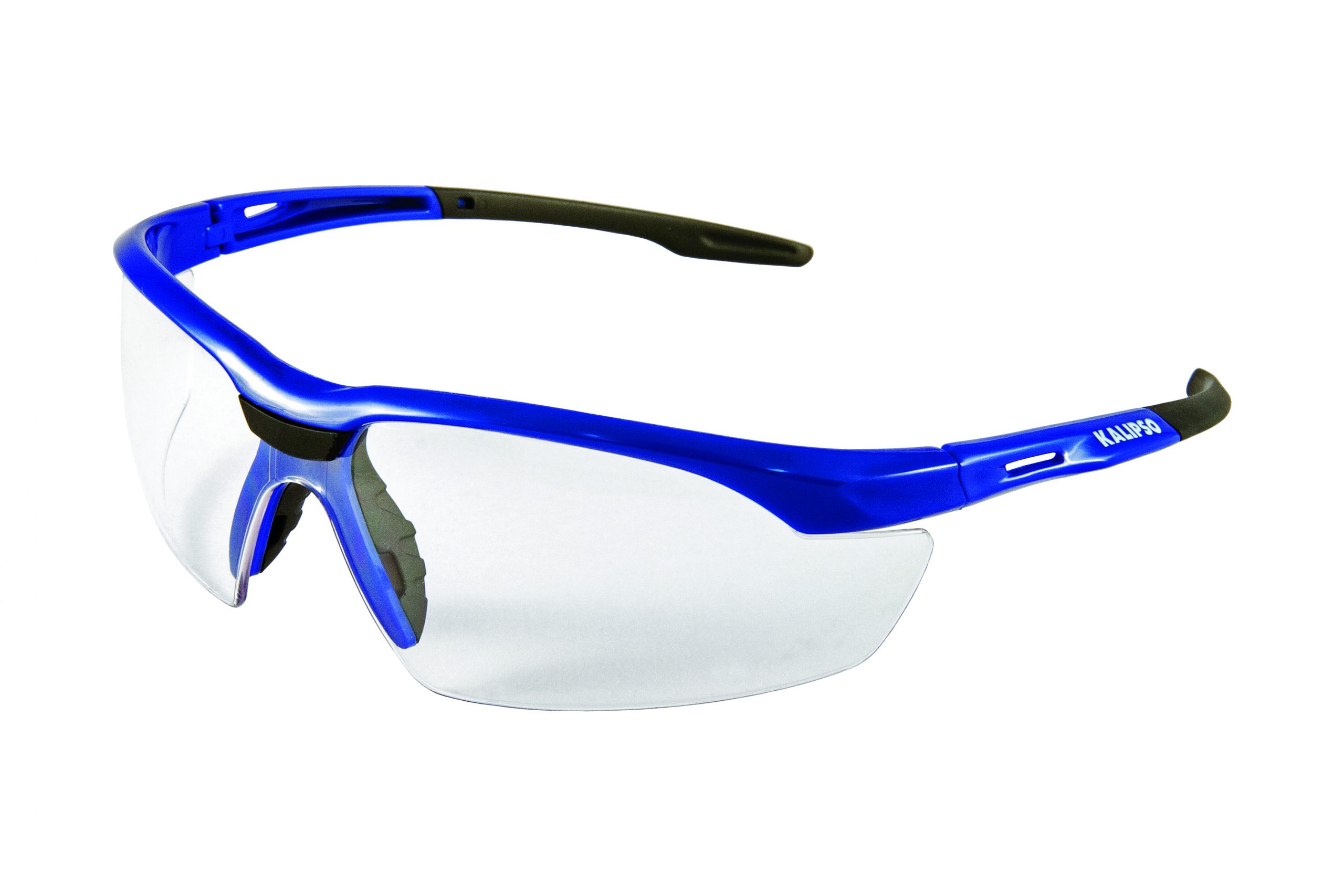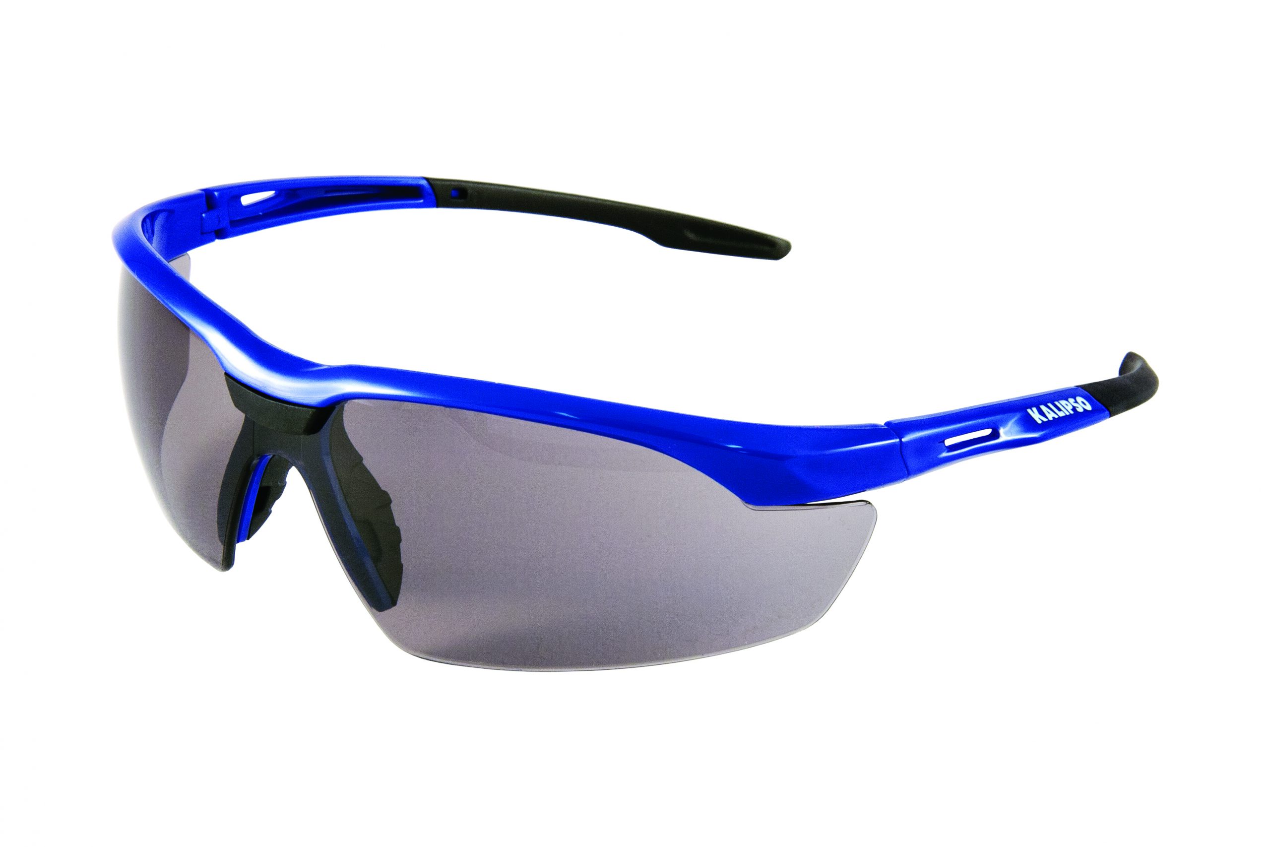 Óculos de segurança constituídos de arco de material plástico (náilon) na cor azul dividido em duas partes pela ponte, duas presilhas centrais, canaletas e fendas para encaixe do visor confeccionado em policarbonato disponível nas cores incolor, incolor com tratamento, cinza, cinza com tratamento, marrom, incolor com revestimento externo de filme prateado (incolor espelhado – in/out), cinza com revestimento externo de filme prateado (cinza espelhado) e cinza com revestimento externo de filme espelhado azul (azul espelhado), ponte nasal em formato “V” confeccionada do mesmo material do arco com seis pinos para encaixe do apoio nasal confeccionado em borracha termoplástica preta, hastes tipo espátula confeccionadas em náilon na cor azul com meia haste de borracha termoplástica, fixadas ao arco através de parafusos metálicos.