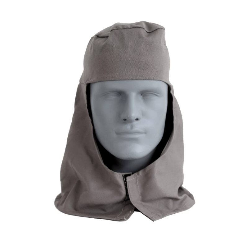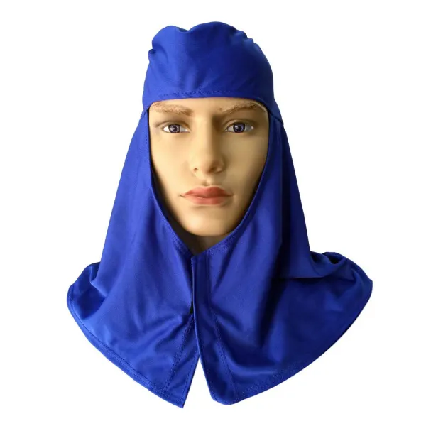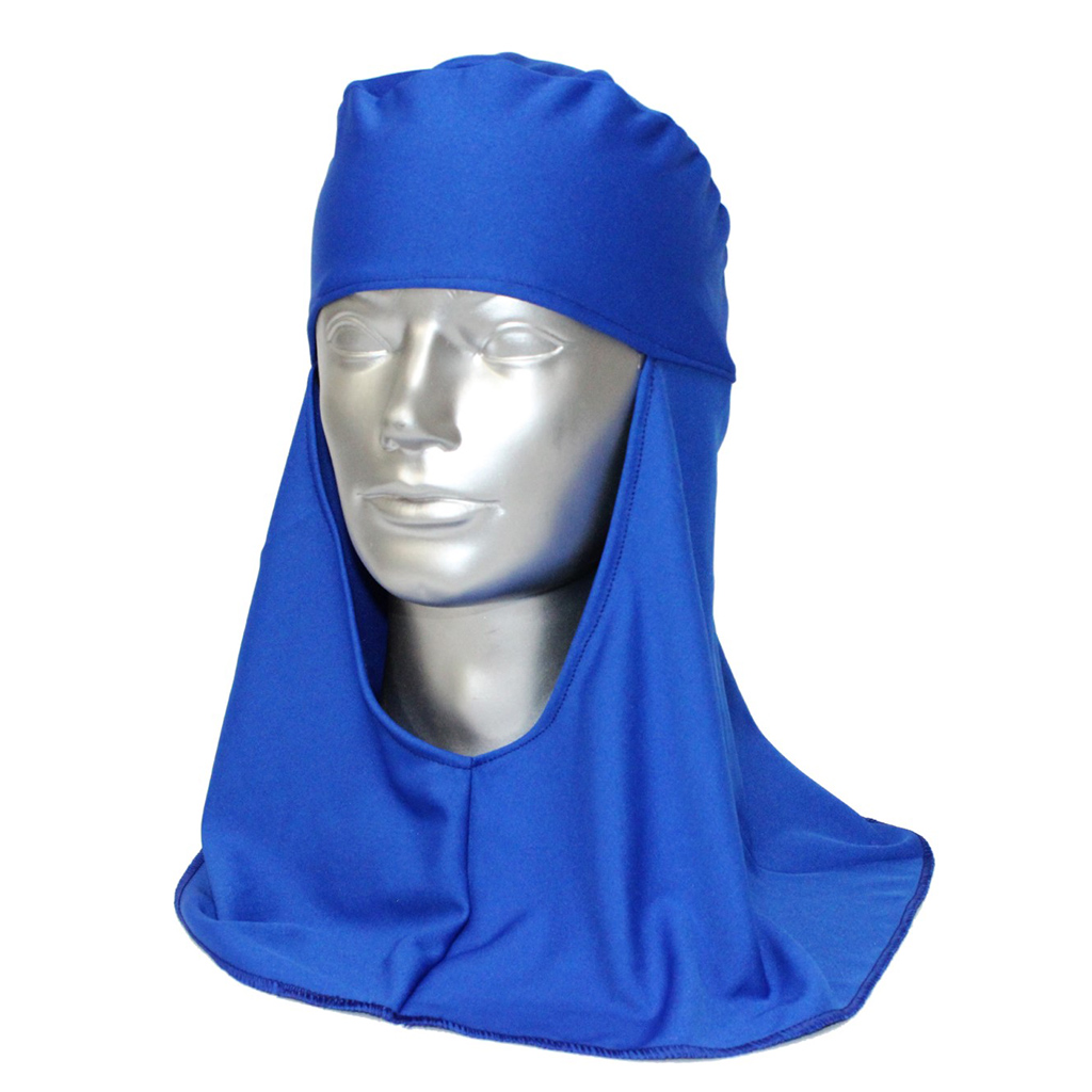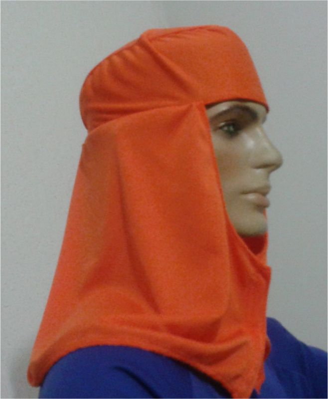 Capuz de segurança confeccionado em tecido helanca 100% poliéster, elástico para ajuste traseiro, velcro para fechamento frontal, e saia tipo árabe até os ombros.